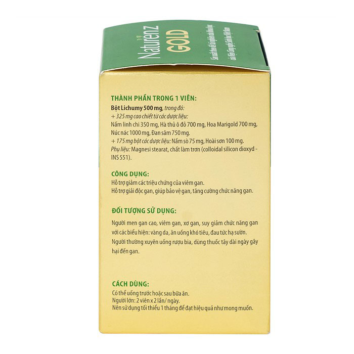 Viên uống Naturenz Gold được bào chế từ nhiều dược liệu quý từ thiên nhiên, chứa các thành phần hoạt chất có tác dụng làm mát gan, hỗ trợ giải độc gan đồng thời bảo vệ và tăng cường chức năng gan. Phù hợp cho người gặp phải các vấn đề về gan như men gan cao, viêm gan, xơ gan,...