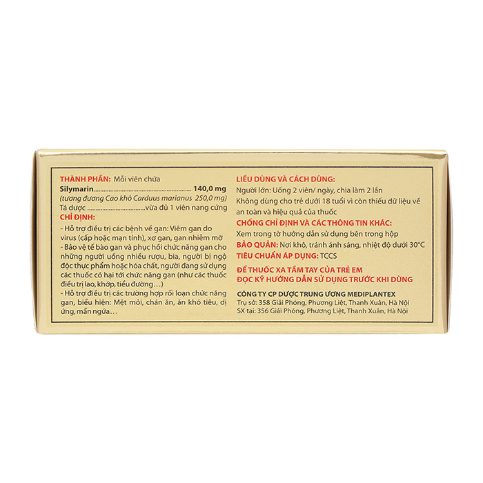 - Silymarin: 140mg (tương đương cao khô Carduus marianus 250mg).