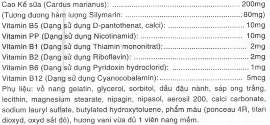 Cao kế sữa (200mg): Đây là thành phần đóng vai trò quan trọng nhất trong việc hỗ trợ chức năng gan. Cao kế sữa chứa Silymarin, một hoạt chất có tác dụng bảo vệ tế bào gan, ngăn ngừa tổn thương gan do các gốc tự do, hỗ trợ tái tạo tế bào gan bị tổn thương. Ngoài ra, Silymarin còn giúp tăng cường khả năng giải độc của gan, giảm viêm gan và bảo vệ gan khỏi tác hại của rượu bia.